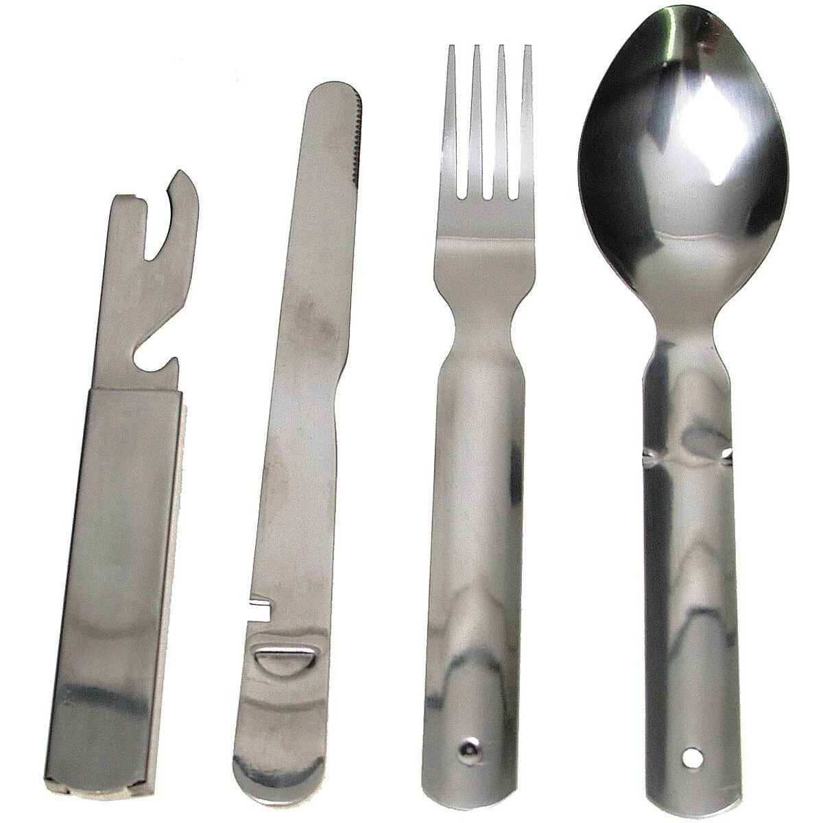 Das Bundeswehr Essbesteck in leichter Ausführung (Nachbau) aus rostfreiem Stahl ist ein ideales Camping Besteck. Es ist 4-teilig und besteht aus Messer, Gabel, Löffel und einem Dosen-/Flaschenöffner. Es kann ganz einfach platzsparend zusammengesteckt werden.