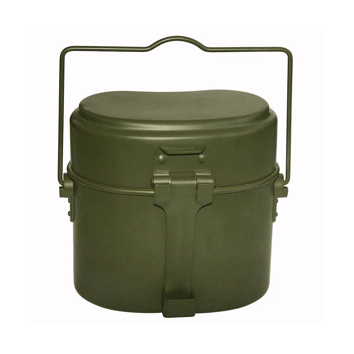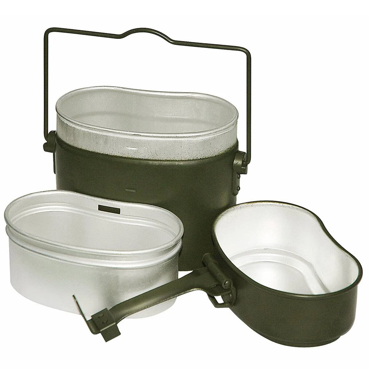 Das bewährte 3-teilige Bundeswehr-Koch- und Essgeschirr wurde original nach Bundeswehr TL gefertigt und besitzt einen Klappbügel.. Es besteht aus einem Kessel mit Henkel (ca. 1,5 l Volumen), einen Einsatz (ca. 0,5 l Volumen) sowie einem Deckel mit Klappgriff (ca. 0,5 l Voumen). Den Deckel kann man auch als Pfanne oder Teller verwenden. Insgesamt ist das Kochgeschirr sehr leicht und handlich. Es kann über offenem Feuer, aber auch mit einem Esbitkocher verwendet werden.