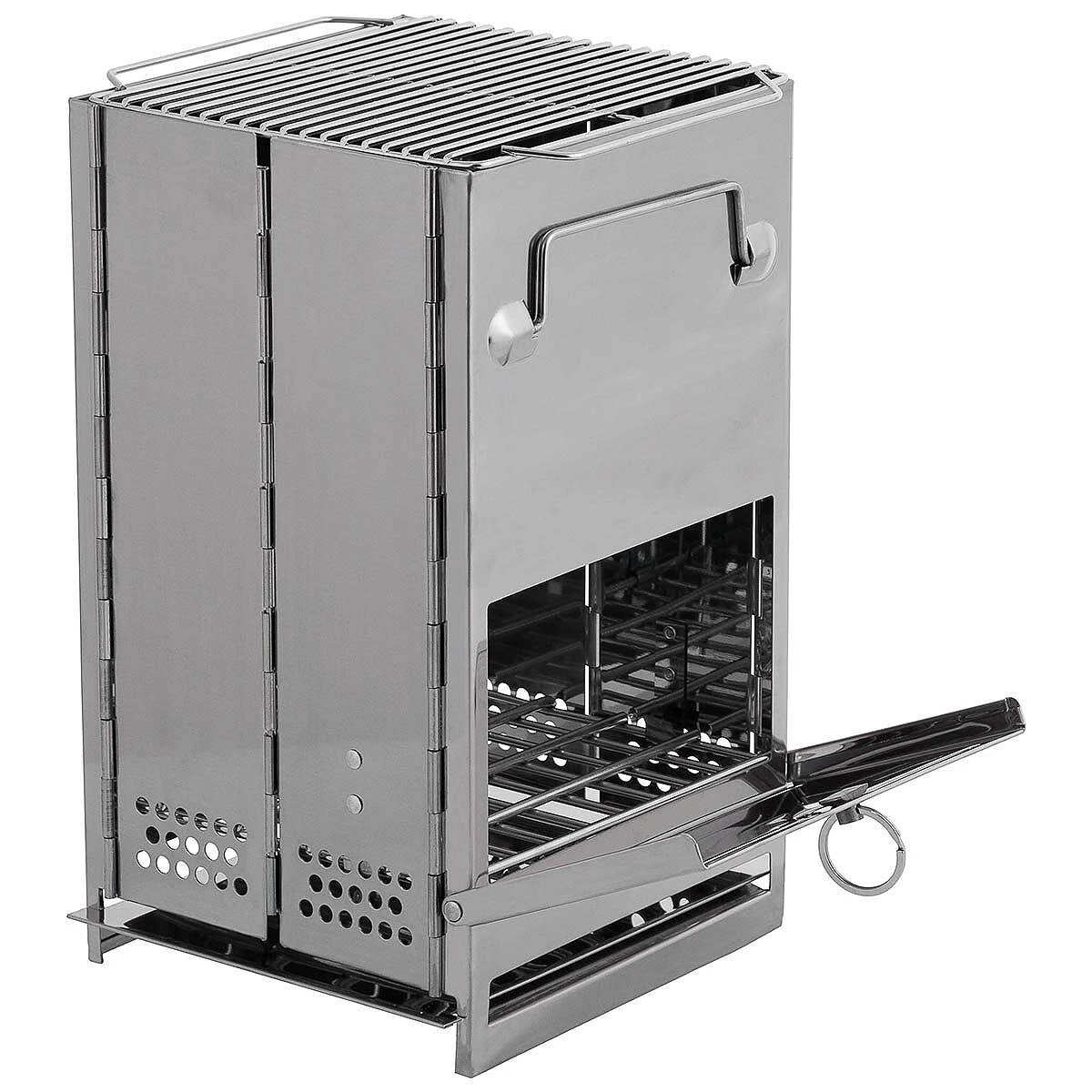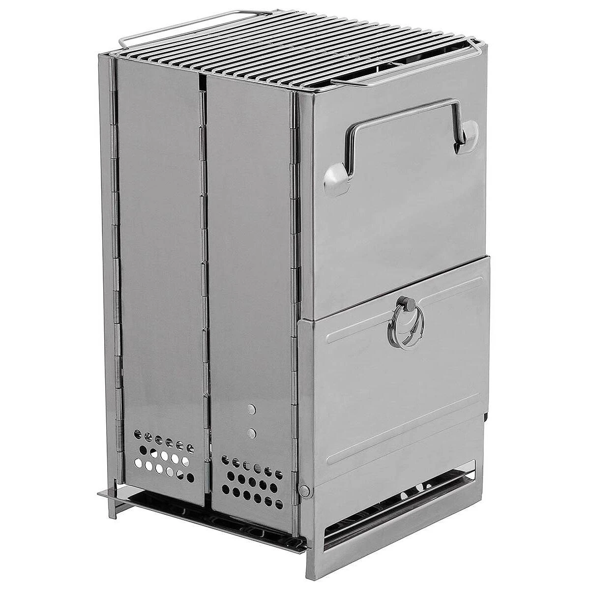 Der Raketenofen von FOX Outdoor ist eine tolle Kochgelegenheit für unterwegs. Er ist durch seinen Faltmechanismus kompakt verstaubar und lässt sich sehr schnell aufbauen. Der Faltherd besitzt ein ausklappbares Bodengitter, ein herausnehmbares Ascheblech, ein Grillrost sowie eine große Frontklappe mit Arretierung. Es gibt Belüftungsöffnungen, die einen Kamineffekt gewährleisten. Alle Teile sind aus rostfreiem Edelstahl gefertigt und lassen sich leicht reinigen. Mittels 2 Klappgriffen lässt sich der Raketenofen leicht tragen. Im Lieferumfang befindet sich außerdem eine praktische Transporttasche.
